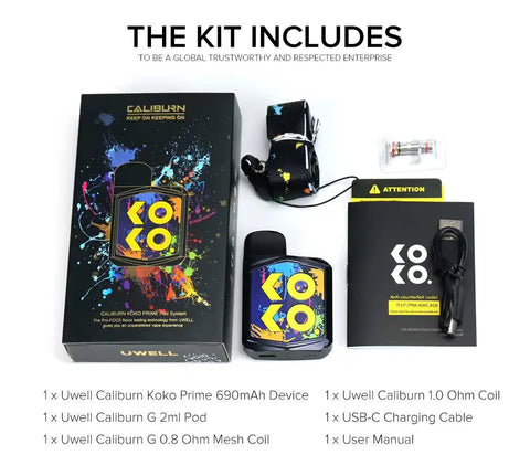 Discover the Uwell Caliburn KOKO Prime, offering a 690mAh battery, magnetic decorative panels, and compatibility with the Caliburn G Pods and Coil Series. Includes a 1.0ohm MTL Coil